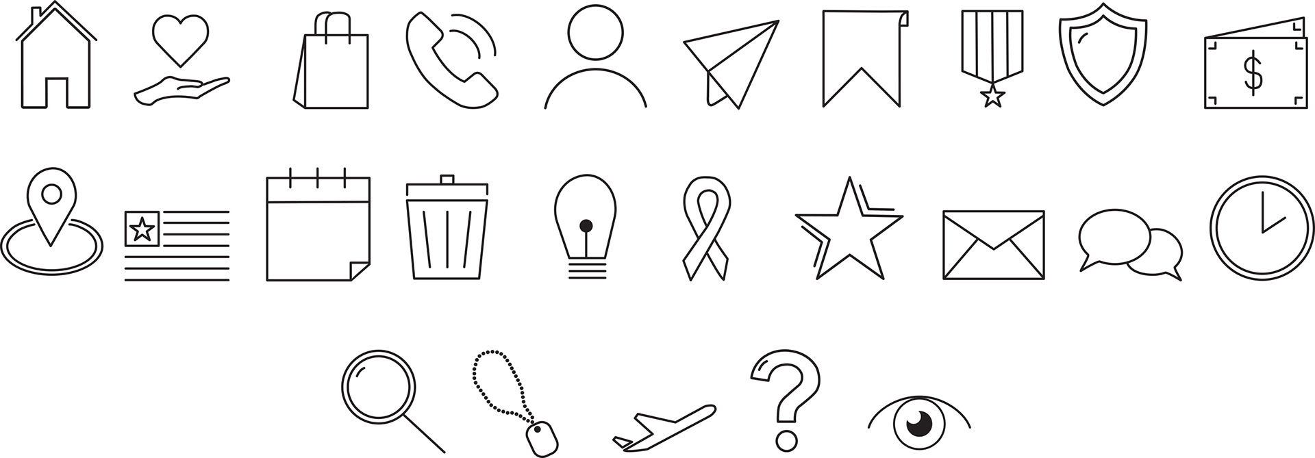 For this student assignment, students were to collect research, sketch ideation, and design a set of icons for a non-profit charity of our choice. The icons are later used for a landing page to engage the audience and help with messaging. The non-profit chosen for this assignment was Mission 22, which is a non-profit for Veterans and their families.