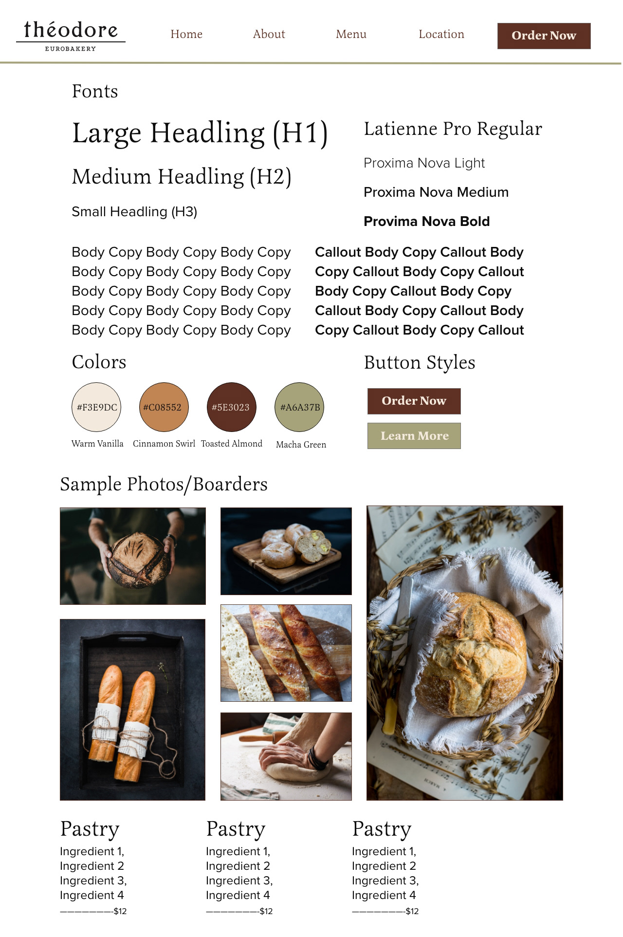 For this student assignment, students were to create a website layout for Theodore Bakery using the given information. We first started out with creating a mood board, and style tile to get an understanding of what we wanted our website to look look. Next, we created three wireframe options, and from there, we created one final prototype based on our best wireframe.